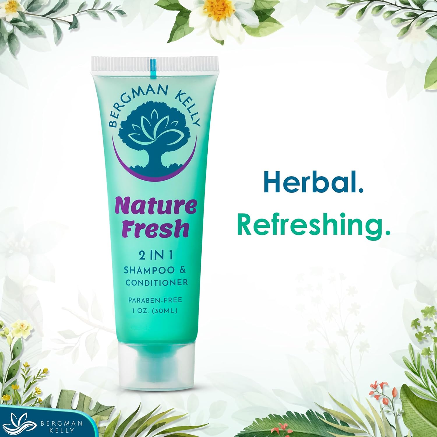 BERGMAN KELLY Travel Size Shampoo & Conditioner 2 in 1 (1 Fl Oz, 100 PK, Tropical Waterfall), Delight Your Guests with Invigorating and Refreshing Shampoo Amenities, Small Hotel Toiletries in Bulk